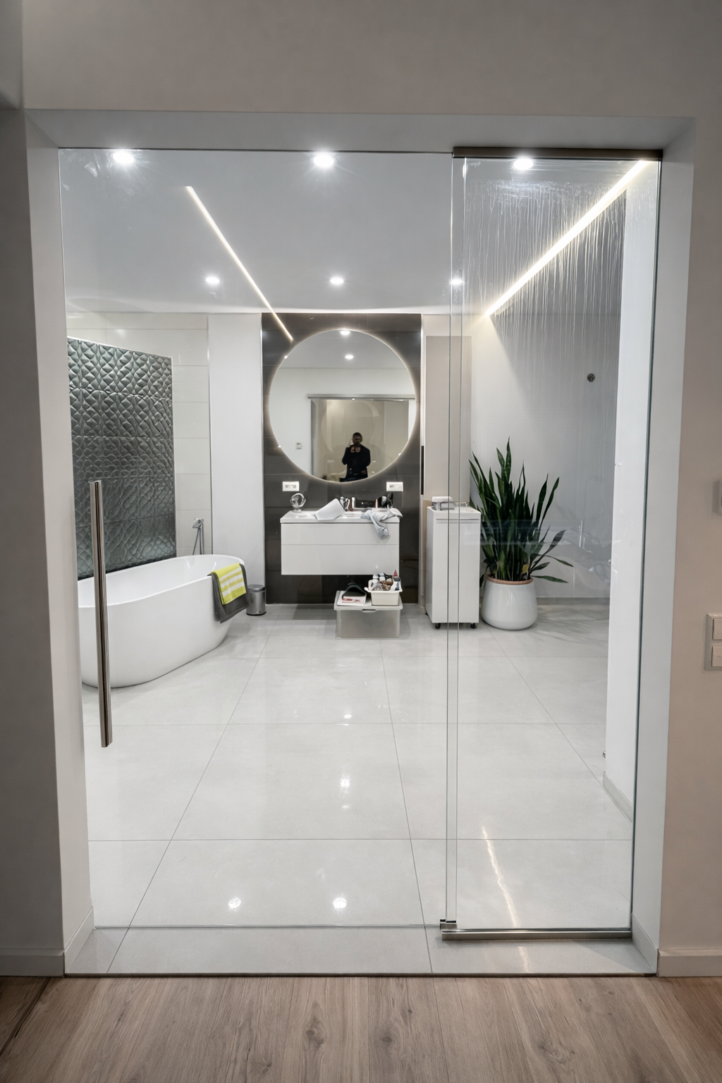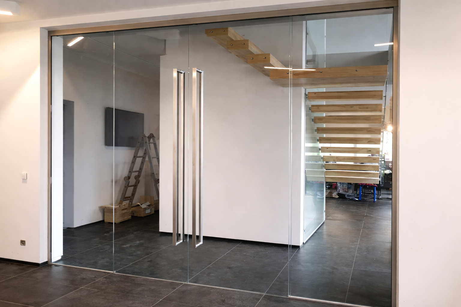 Wir fertigen individuelle Ganzglastüren exakt nach Maß – ob klassische Drehtür, moderne Schiebetür oder elegante Glastrennwand.